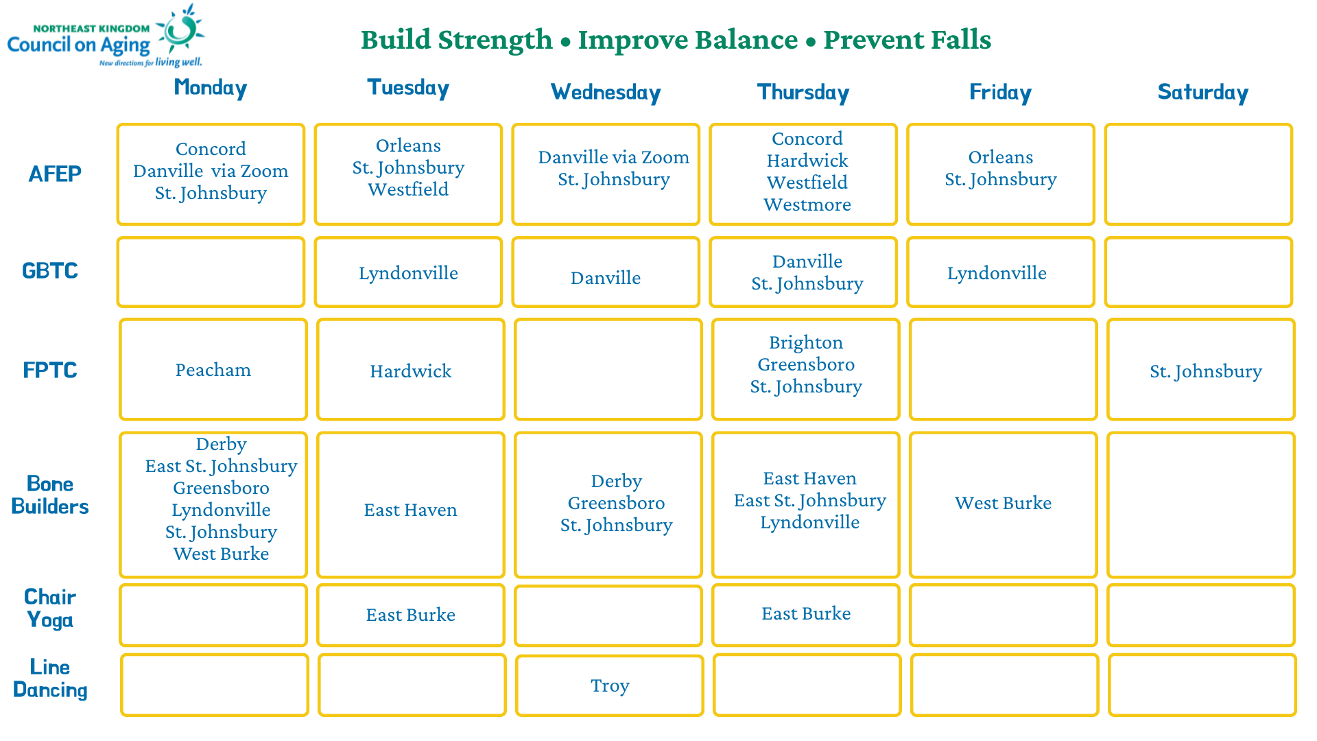 The Northeast Kingdom Council on Aging offers free wellness programs to help older adults stay strong, steady, and connected. All classes can be adapted for seated participation to meet individual needs.